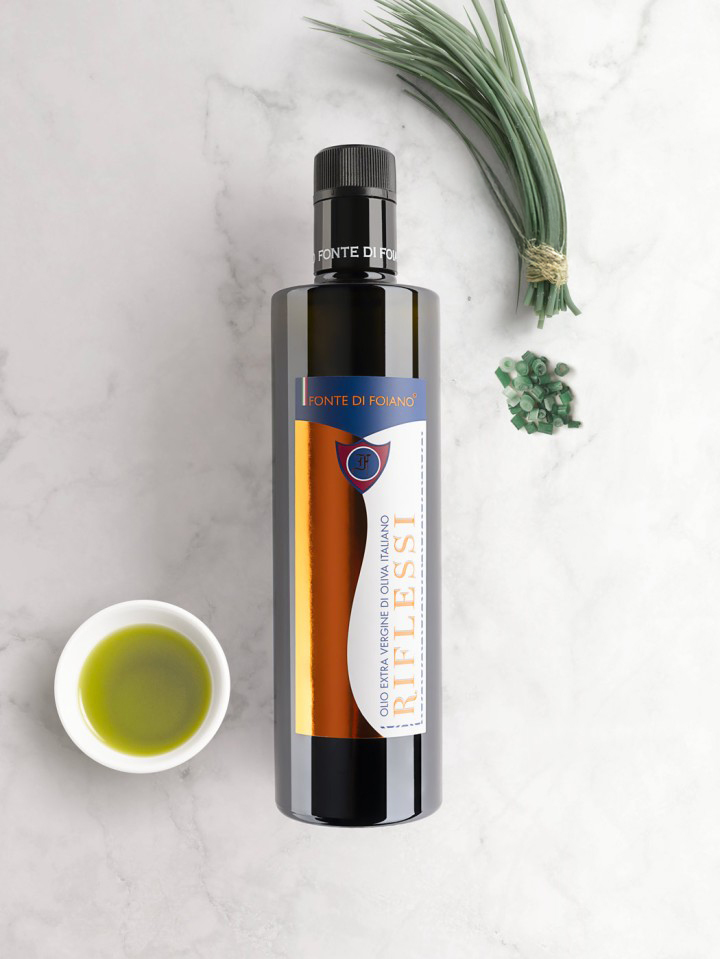 Riflessi extra virgin olive oil is a lightly fruity oil, a single-variety blend of 100% Maurino olives. Harvested in October, it has a clear, filtered appearance and a deep golden yellow color with subtle green hues.