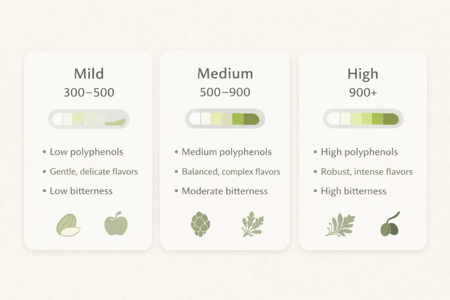 - Why concentration matters: Polyphenol levels naturally decline over time as the oil oxidises, which is why freshness is an important quality indicator. Oils made from early-harvest fruit and processed quickly tend to retain more of their original phenolic content, which supports both flavour intensity and chemical stability. Choosing a recent harvest ensures you experience the oil as the producer intended—vibrant, aromatic, and full of character.
